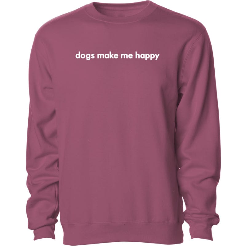 Embroidered with the phrase "Dogs make me happy", this sweatshirt will stylishly express your love for dogs. Available in a berry, midnight dream, or mountain spruce, it is puppy soft and decorated right here in the U.S.A. Machine wash and dry.