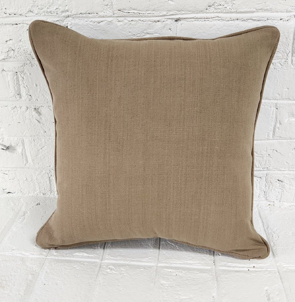 This pillow cover is custom designed in Blues and Taupe and a touch of White . Also features coordinating taupe colored back and welt cord.