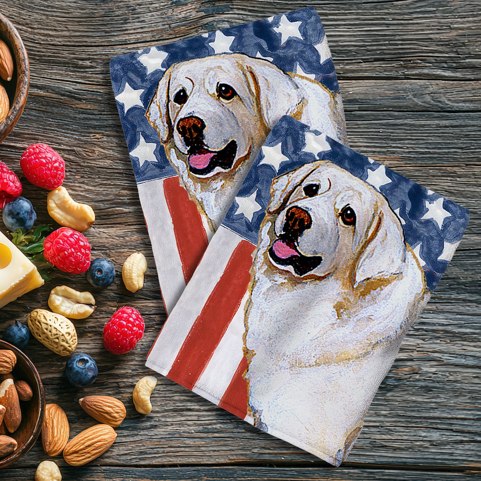 This small Virginia studio is known for their original decor items and home goods, each artistically rendered to display your favorite dog breed. These 2-Piece 16" W x 25" H Kitchen Towel Sets display your breed of choice against an American Flag background.