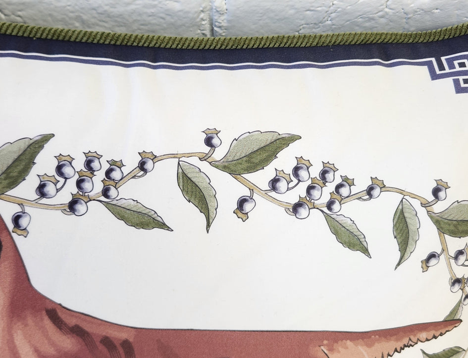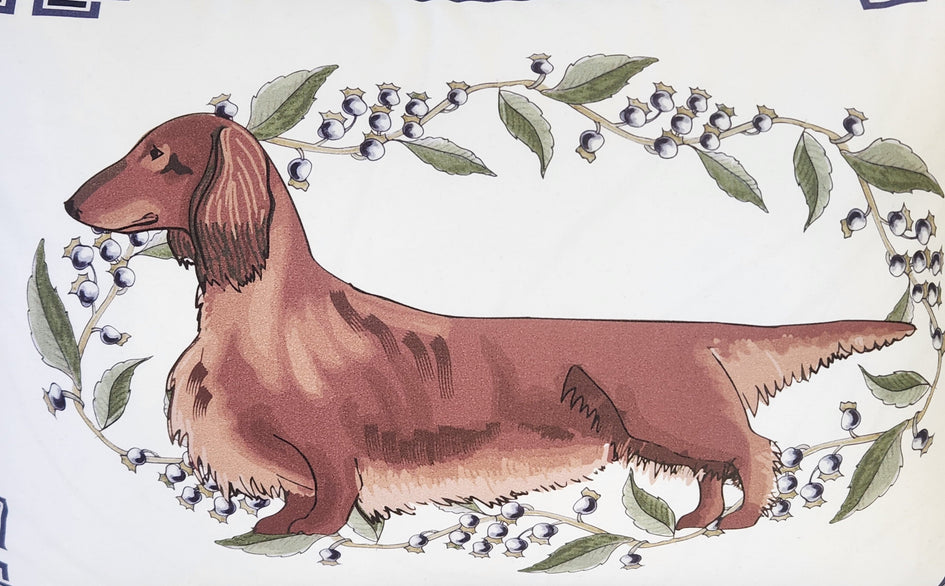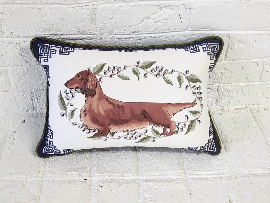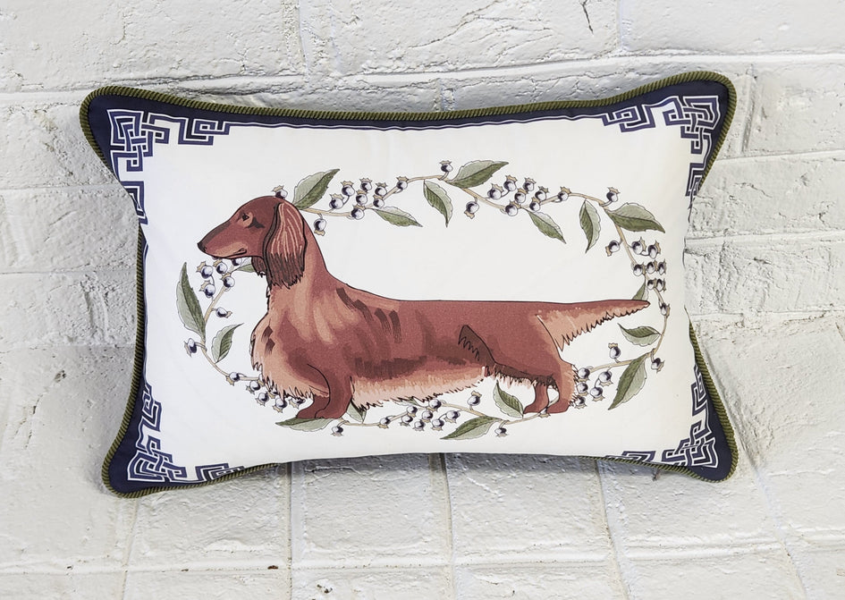 - Long-haired Dachshund Pillow Cover - In Navy, Sage Green and White